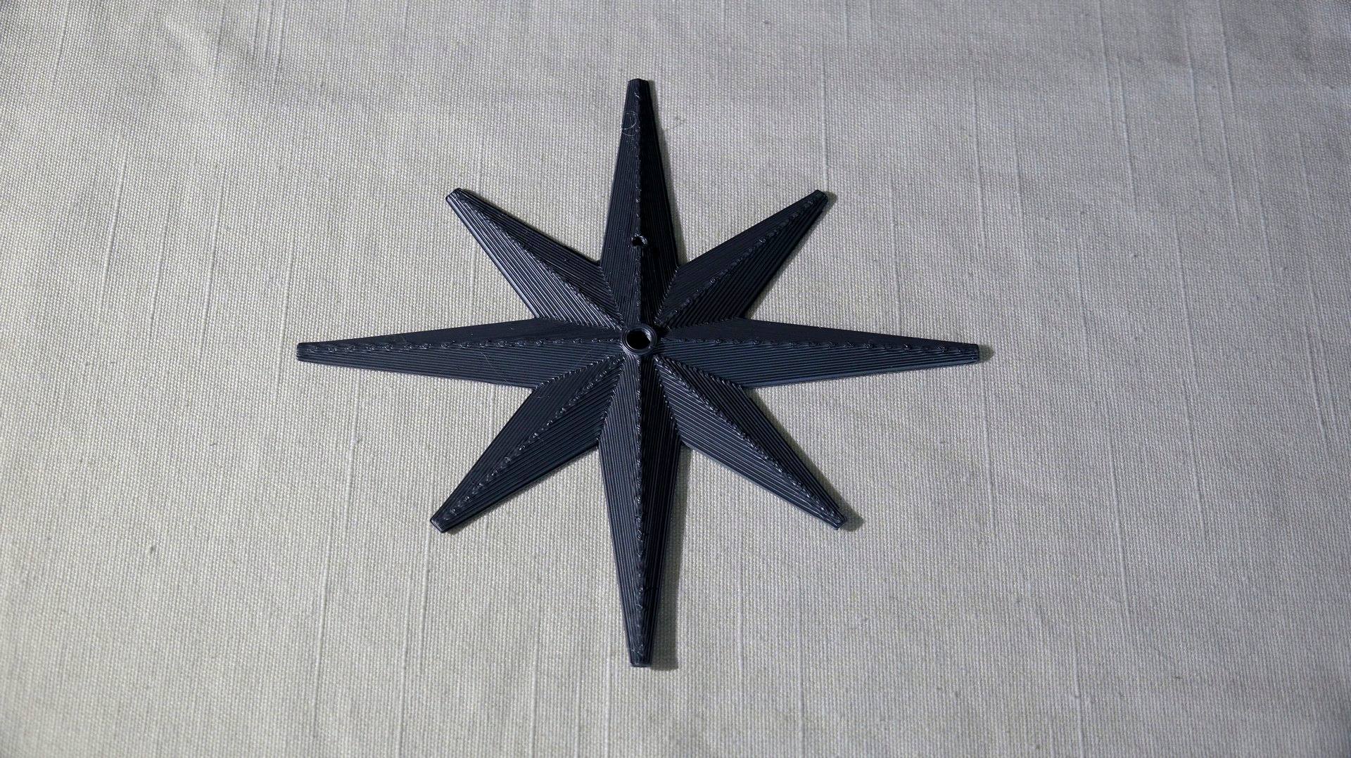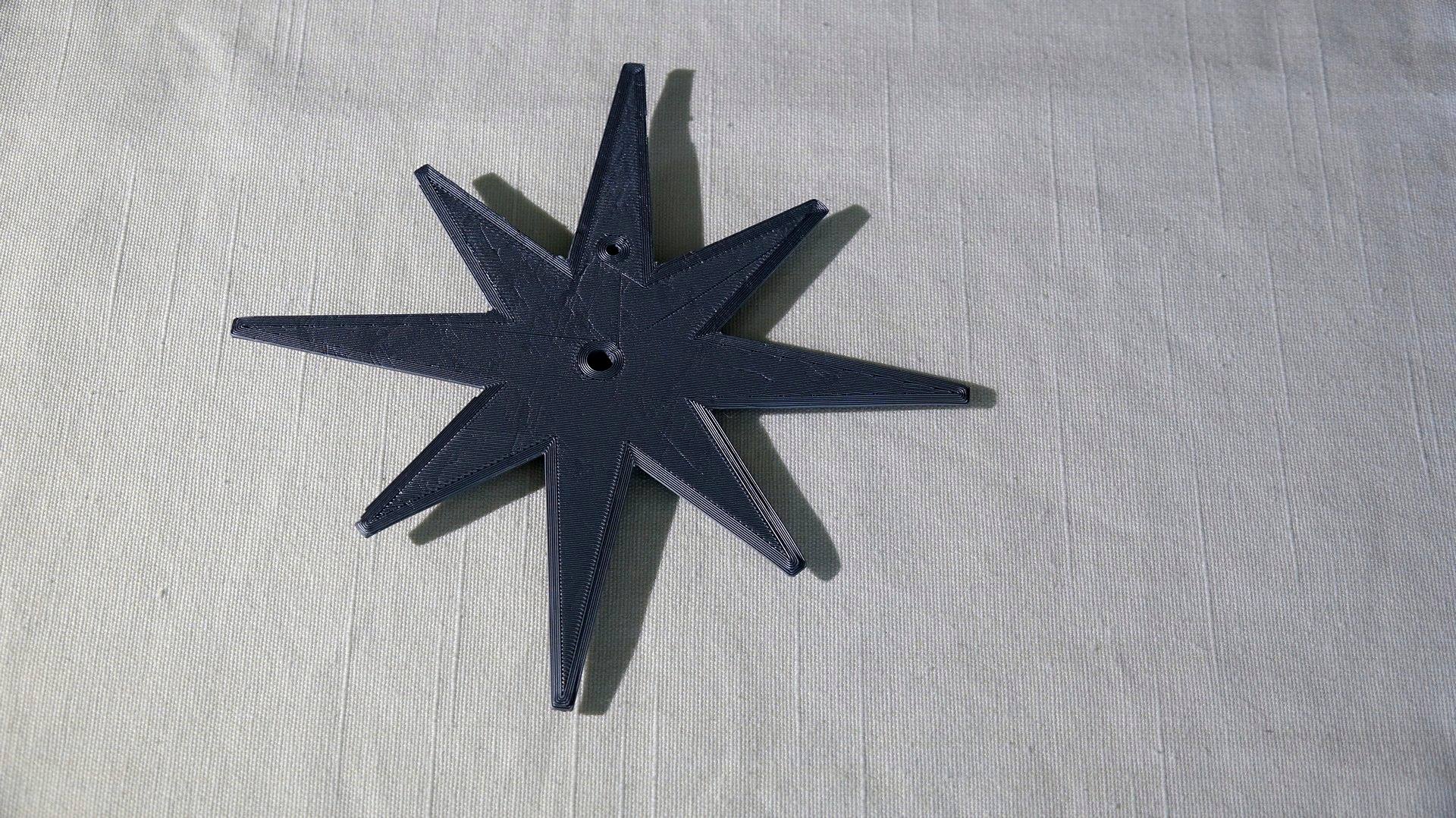 PLA-muovista 3d tulostettu koriste, jossa kolo ripustamiseen. Koristeen pohjapuoli on melko sileä, johon voi liimata esimerkiksi kaksipuolisen tai magneettiteipin kiinnitykseen. Lisäämällä hieman liimaa teipin ja koristeen väliin on liimapinnan pito pienestä pinnan epätasaisuudesta johtuen parempi.