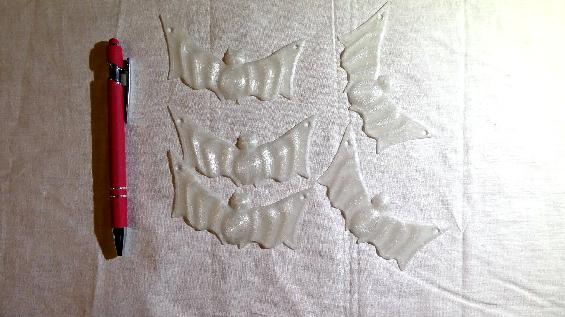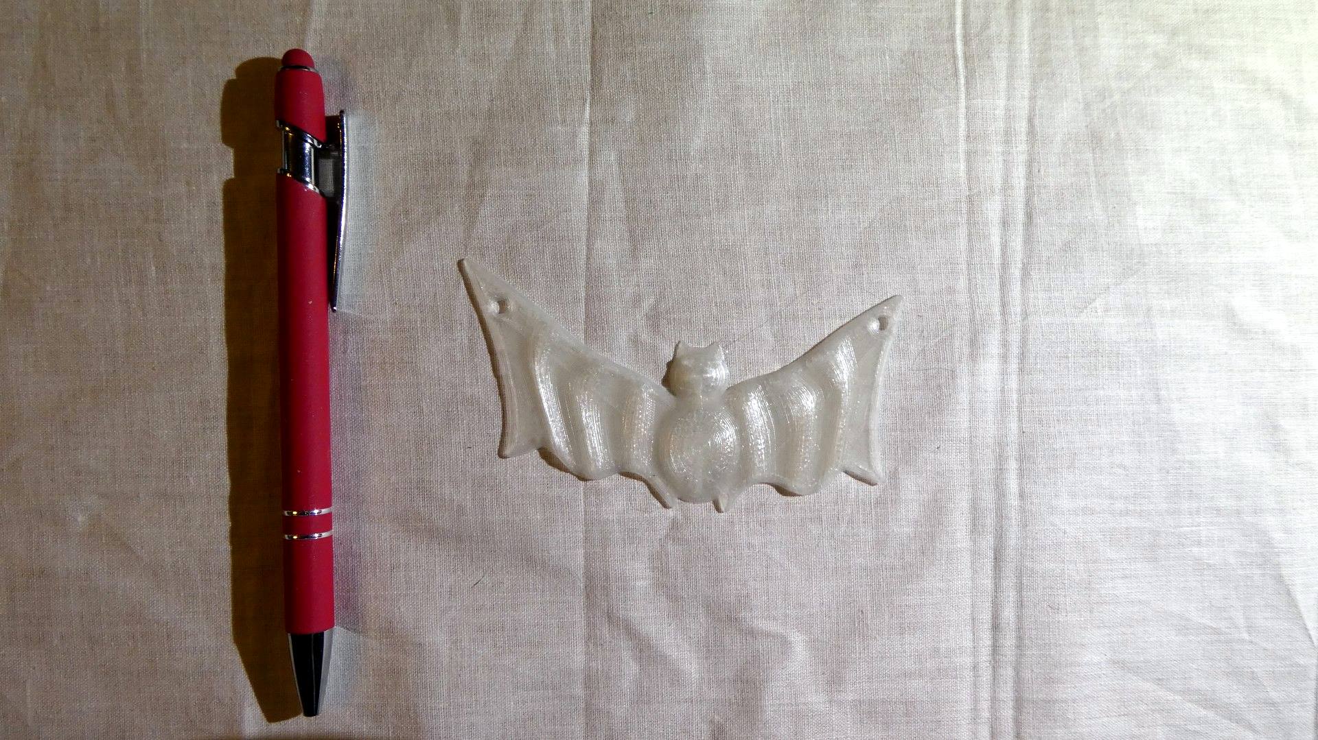 PLA-muovista 3d tulostettu koriste, jossa kolot kiinnitykseen langalla. Koristeen pohjapuoli on melko sileä, johon voi liimata esimerkiksi kaksipuolisen– tai magneettiteipin kiinnitykseen. Lisäämällä hieman liimaa teipin ja koristeen väliin on liimapinnan pito pienestä pinnan epätasaisuudesta johtuen parempi.