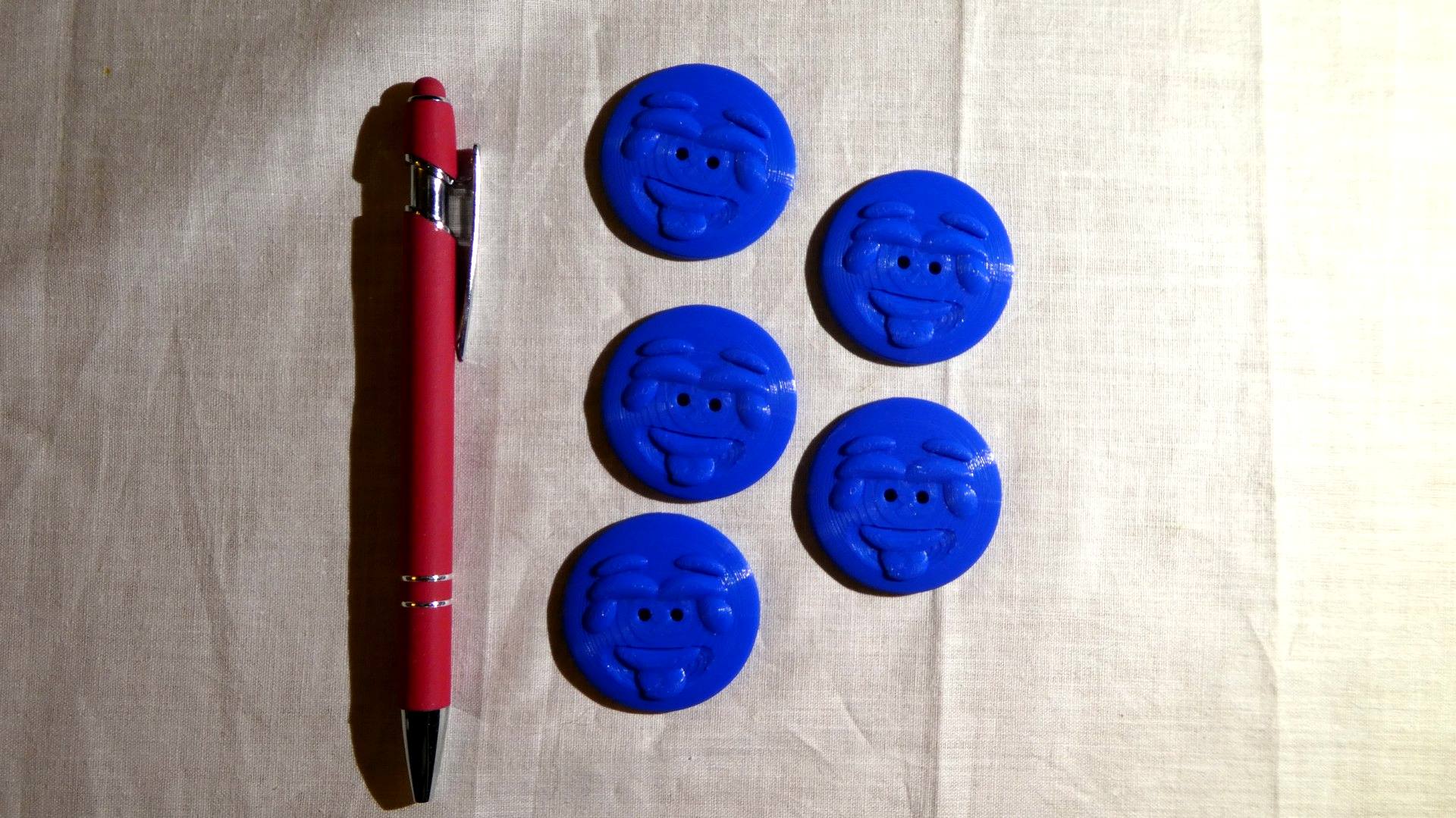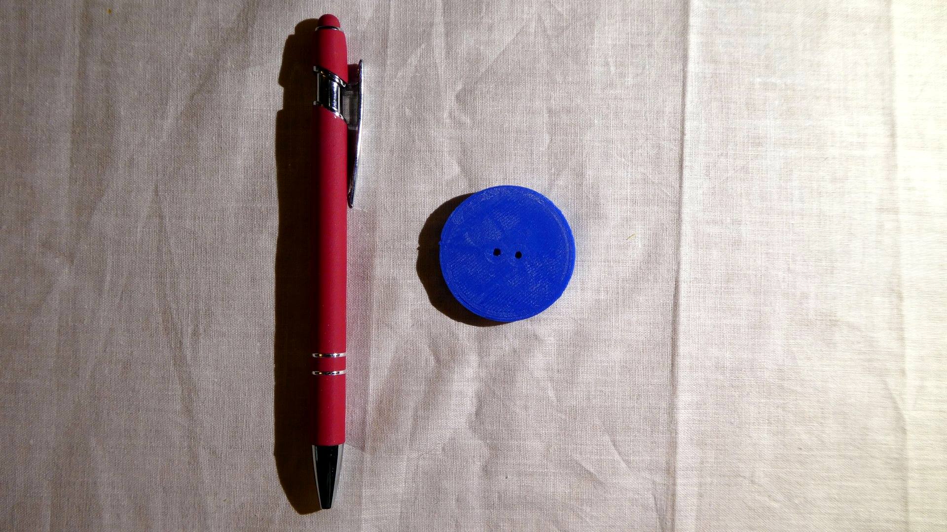 PLA-muovista 3d tulostettu koristenappi, jossa kolot kiinnitykseen langalla. Koristeen pohjapuoli on melko sileä, johon voi liimata esimerkiksi kaksipuolisen– tai magneettiteipin kiinnitykseen. Lisäämällä hieman liimaa teipin ja koristeen väliin on liimapinnan pito pienestä pinnan epätasaisuudesta johtuen parempi.